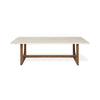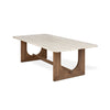 - Rounded corners on honed travertine tabletop soften the table edges.